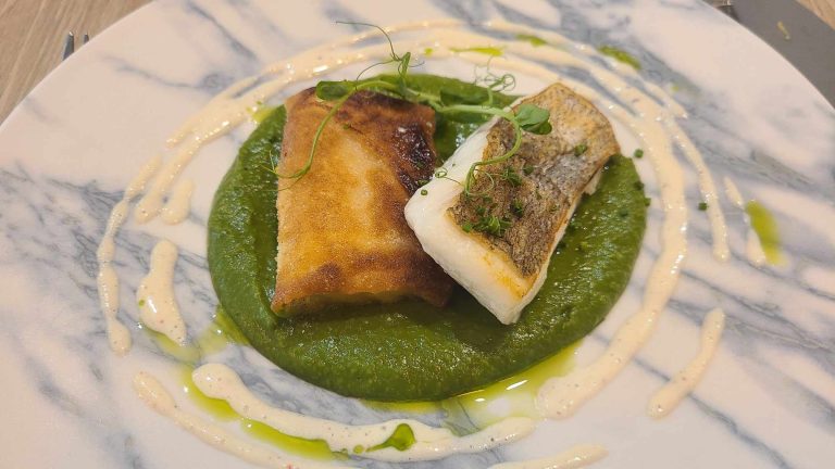 Derrière on enchaîne un mal aimé des cantines : le petit pois, ici en mousseline, pimpé par un coulis au raifort. Dessus on a placé un filet de merlu et une polenta croustillante. A la table d’à côté on entend que ce serait un peu sous-assaisonné, ça ne nous a pas choqué. Au passage, on salue l’effort d’avoir apporté du beurre avec le pain. Et un beurre aromatisé au piment d’Espelette.
