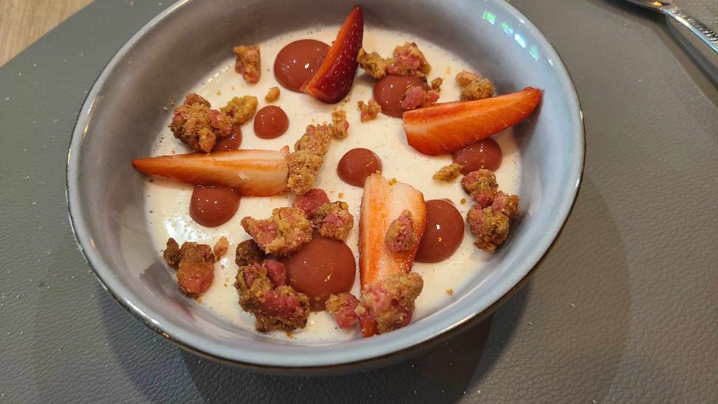Pour le dessert, bonne idée que cette panna cotta au lait de coco avec des fraises bien mûres et juteuses. Le crumble aux pralines roses apporte un croustillant et une gourmandise bienvenues mais l’ensemble nous a semblé un peu trop sucré. Ce qu’on retiendra ? Un service rapide, souriant et curieux ; une déco soignée ; une carte appétissante, courte et de saison, dans un établissement à taille humaine de moins de 30 couverts… Si vous réservez pour 3 ou 4, demandez la table en mezzanine, vous devriez apprécier.