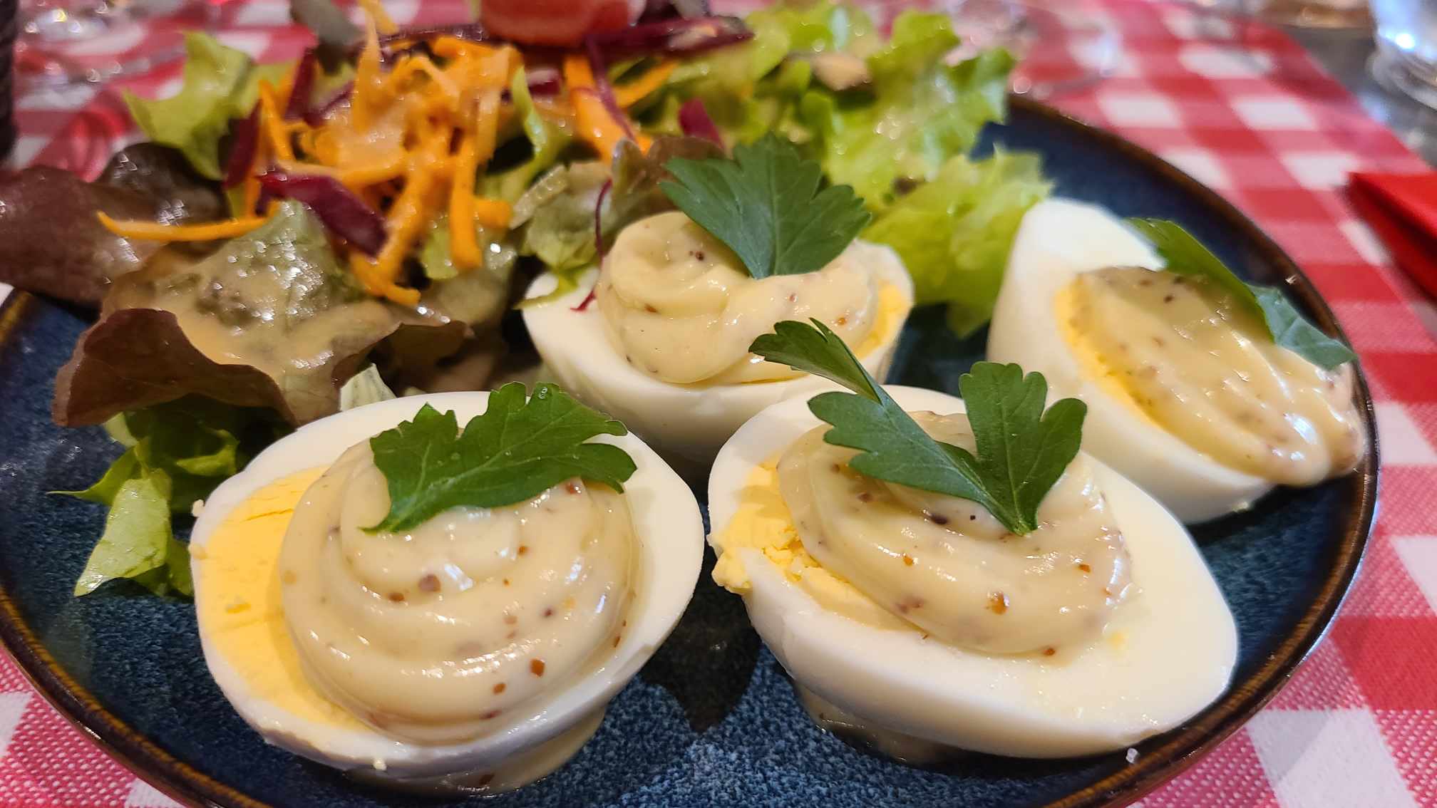Le midi, une formule entrée-plat-dessert est proposée à 26€, ou 21€ avec entrée-plat ou plat-dessert. C’est plutôt un prix correct. On débute avec des œufs mayo plutôt généreux. Bien cuits, et sauce réussie. La terrine du chef est également très bien assaisonnée et accompagnée d’un pain de la boulangerie tourangelle qui monte : Les 3 Grains, vue dans La meilleure boulangerie de France sur M6 et qui réalise un pain spécial pour Les Copains d’Abord.