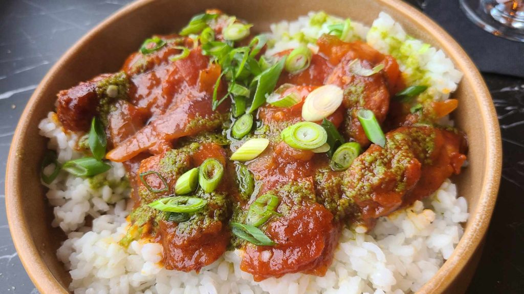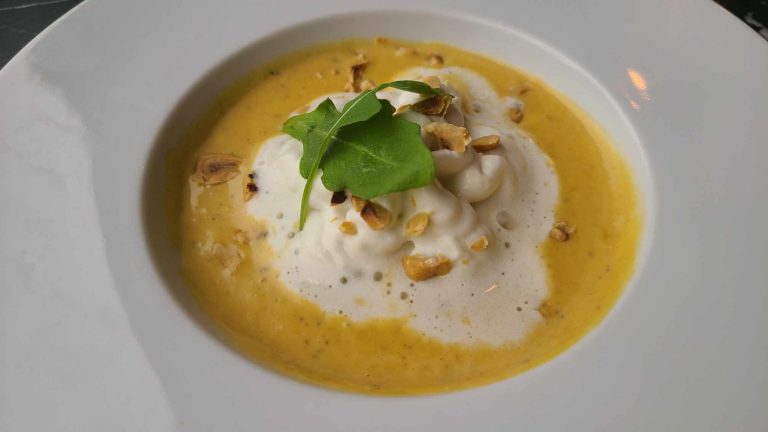 Pour notre entrée, on opte pour du réconfort avec un bon velouté de butternut et sa chantilly au chèvre. Pour le coup, une association qui fait toujours son effet entre la douceur de la courge et le côté puissant du fromage. Excellent. En plat, on se laisse tenter par le rougail-saucisse, plat traditionnel de La Réunion qu’on ne voit pas assez sur les cartes. Il fait plaisir mais dommage, le riz manquait d’assaisonnement. En dessert, on a pris une mousse choco-cacahuète.