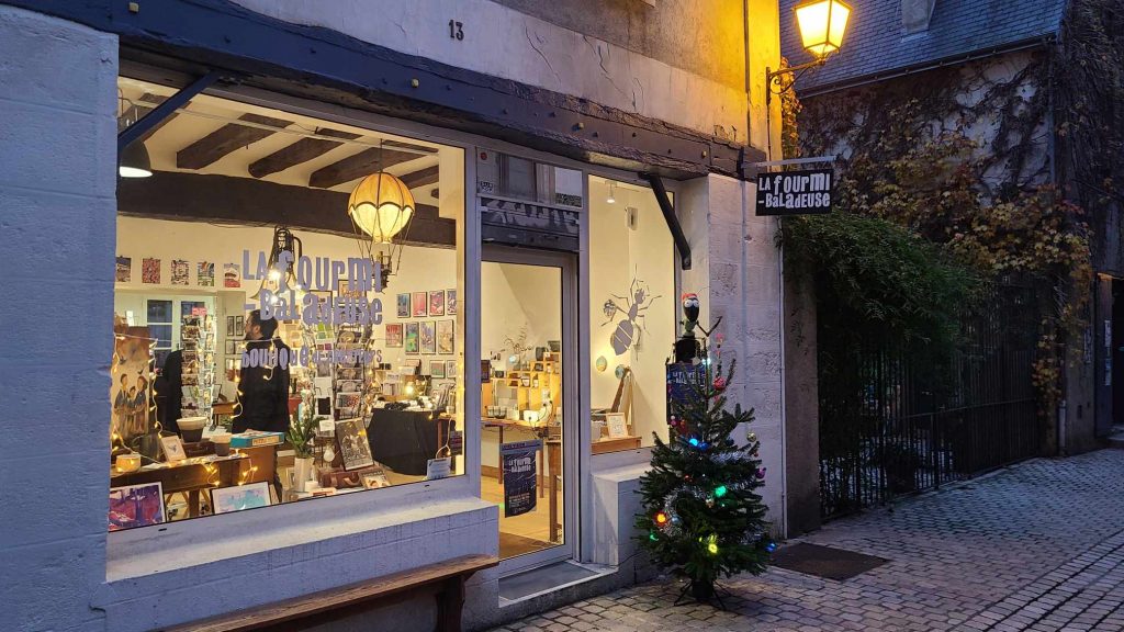 2 – La Fourmi Baladeuse : voilà une autre habituée de la période des fêtes. Également présent l’été à Chinon, ce collectif d’artisans locaux s’installe une fois de plus dans le Vieux-Tours, cette fois Rue du Petit Saint-Martin après un passage Rue Bretonneau en 2023. On y découvre des céramiques, des sculptures en métal par Eric Geffroy, des luminaires, les drôles de cartes postales et affiches façon BD de Cloomy ou les superbes dessins de Lohengrin Papadato, l’artiste qui a décoré le Pont Wilson de ses drapeaux pendant l’été.
