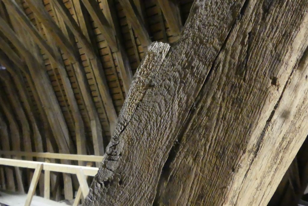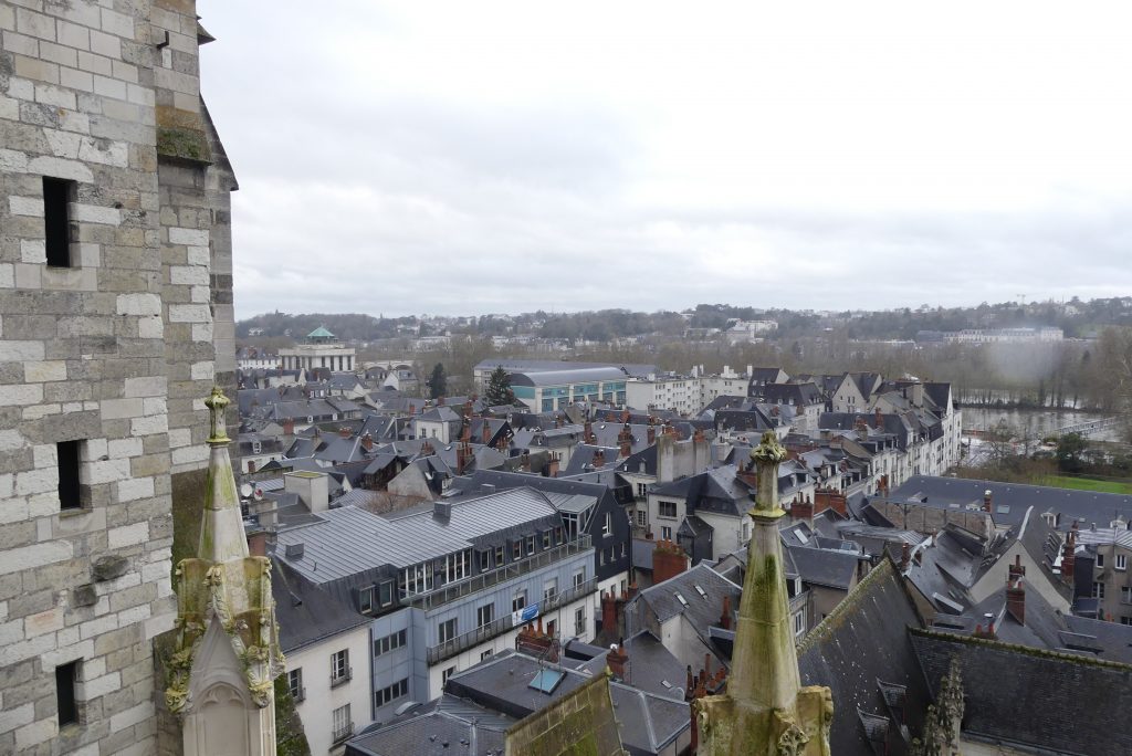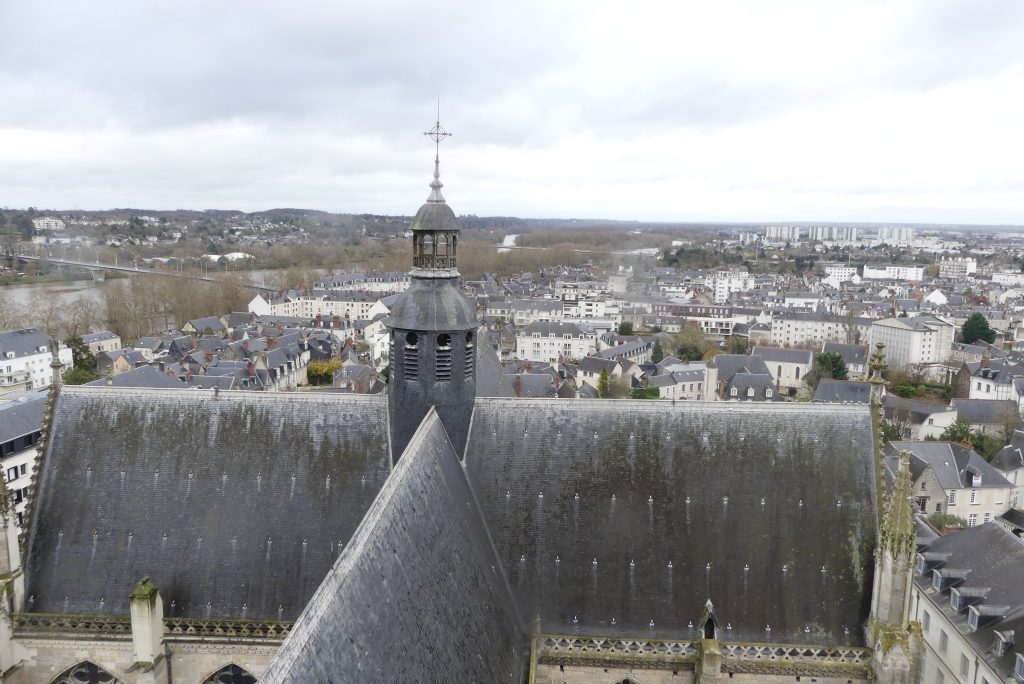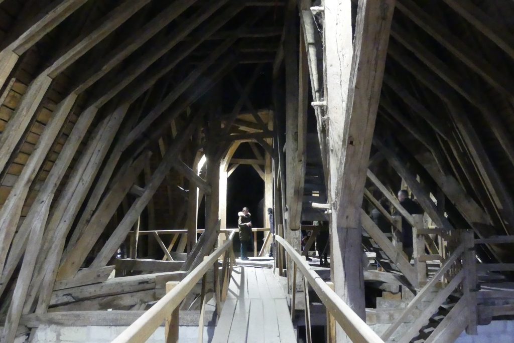 Ensuite on grimpe dans les combles, avec déjà une première vue sur la ville, notamment le Cloître de la Psalette et les gargouilles. On peut toucher les poutres de chênes issues d’une plantation de Cheillé. Façonnées au XIIIe siècle, à partir de 1255, elles n’ont pas bougé depuis 8 siècles et sont protégées par un système anti-incendie composé de plusieurs détecteurs de fumée et d’extincteurs.