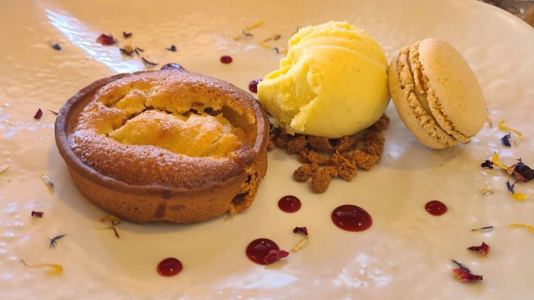 Pour notre test un midi au déjeuner, on débute le repas avec un œuf croustillant façon meurette (lardons, sauce au vin). Une assiette généreuse avec un œuf bien cuit. S’ensuit un pavé de merlu avec tagliatelles de légumes, satay et une sauce beurre blanc au miso qui lie délicatement ce plat parfumé. Encore une fois l’assiette est bien garnie. Et le dessert ne déroge pas à la règle avec tartelette poire amandine tiède accompagnée de sa boule de glace.