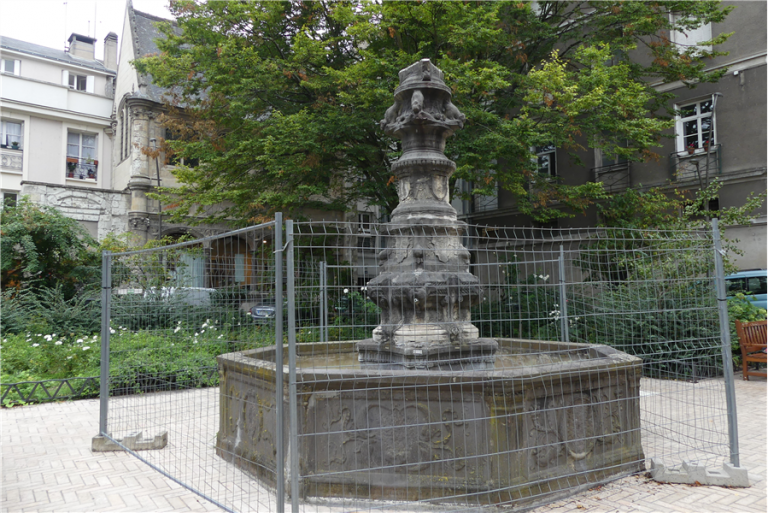Pour le début de l’histoire, il faut remonter 5 siècles en arrière. Le monument a été édifié en 1511 grâce à Jacques de Beaune, alors général des finances royales. Il a été sculpté dans l’atelier de Michel Colombe avec l’aide du maître fontainier Pierre Valence et a connu plusieurs emplacements, notamment Place du Grand Marché, avant d’être installé entre la Rue Nationale et la Rue Jules Favre, dans un passage discret où elle n’est pas vraiment mise en avant, d’autant plus qu’elle très abimée, et en partie cassée.