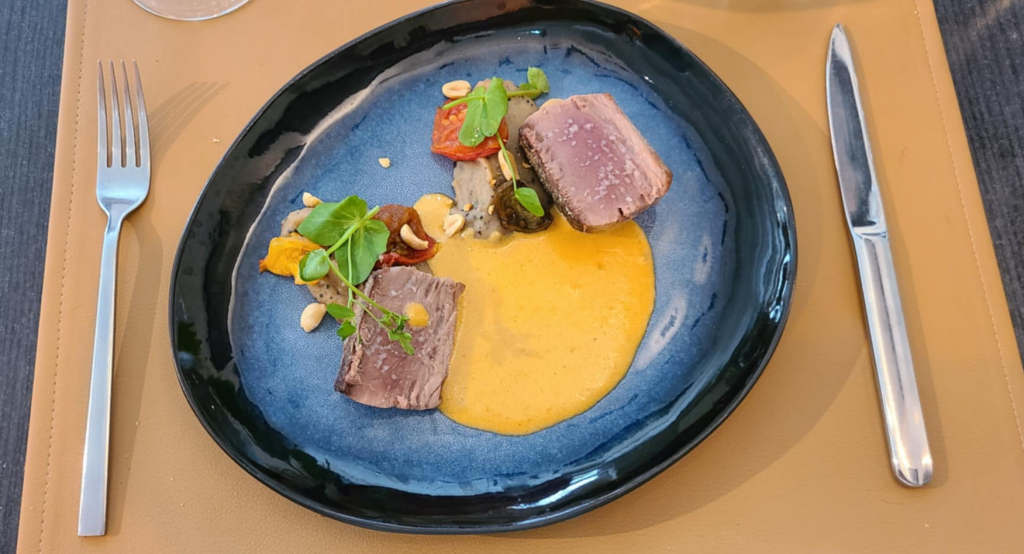 Si on veut plus original, il faut néanmoins s’aventurer dans la carte avec des propositions restreintes mais qui claquent comme cette entrée au poulpe avec un sorbet pastèque et xérès au goût subtilement épicé. De quoi rendre vos canicules beaucoup moins ronflantes. On se laisse aussi convaincre par le cromesquis de veau avec caviar d’aubergines et émulsion parmesan + noisettes, même si cette association n’a pas totalement produit l’effet escompté.