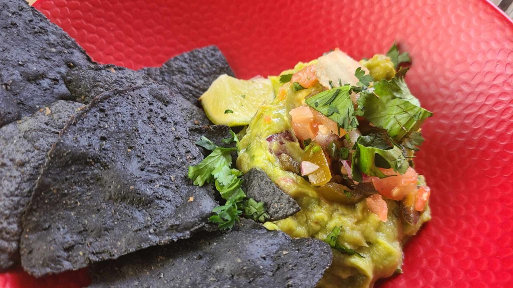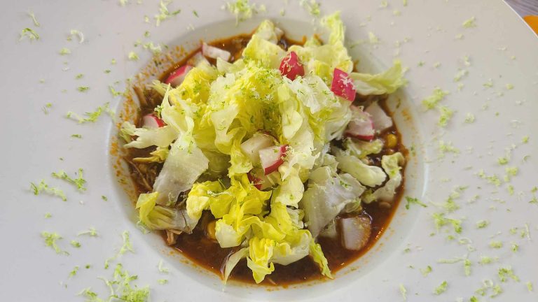 On retrouve d’ailleurs l’esprit tapas avec un guacamole parmi les entrées. Généreux en avocat, bien assaisonné. On l’accompagne de tortillas noires et de mocktails maison à moins de 10€ (virgin colada à l’ananas, très bien, et une autre recette à l’hibiscus, tout aussi rafraîchissante). On teste dans la foulée la soupe poulet, maïs, haricots blancs, piment doux avec radis, laitue et citron vert. Ça arrive vite, c’est servi avec le sourire et c’est bon.