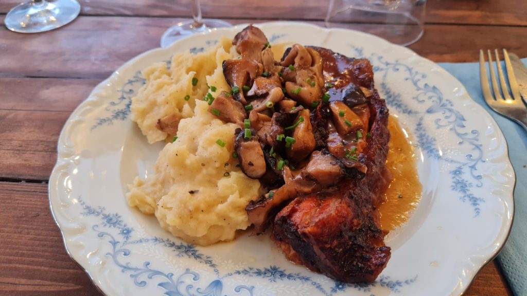 En plat, on a goûté les bons arancinis de millet avec du comté 18 mois et tagliatelles de courgettes marinées à la marjolaine. Assez épicé mais excellent. Mention spéciale aussi à l’originale recette de riz frit aux légumes de saison avec la truite du moulin de Langeais. Hormis pour la poitrine de cochon et sa purée à l’ail rôti, les portions de protéines ne sont pas très importantes, mais les plats restent copieux.