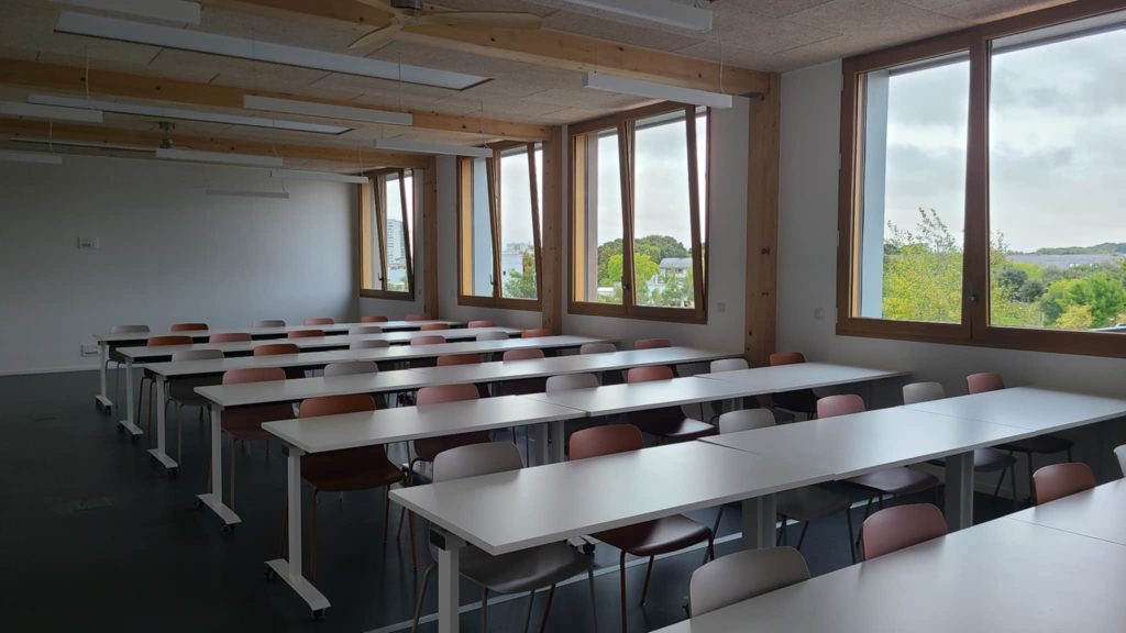 Au programme : des salles de cours aux tables modulables pour former des groupes de travail, un immense amphithéâtre au rez-de-chaussée, des petites salles pour s’isoler mais aussi des espaces de détente, jusqu’à un toit-terrasse avec vue dégagée sur le quartier des Deux-Lions, les Rives du Cher ou les Fontaines.