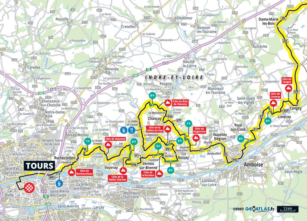 Ensuite, le parcours se poursuivra sur les routes du Loir-et-Cher en passant par la ville de Vendôme, pour, par la suite, une entrée dans le département d’Indre-et-Loire, au 134e kilomètre, avec la ville de Dame-Marie-les-Bois puis de Cangey.
