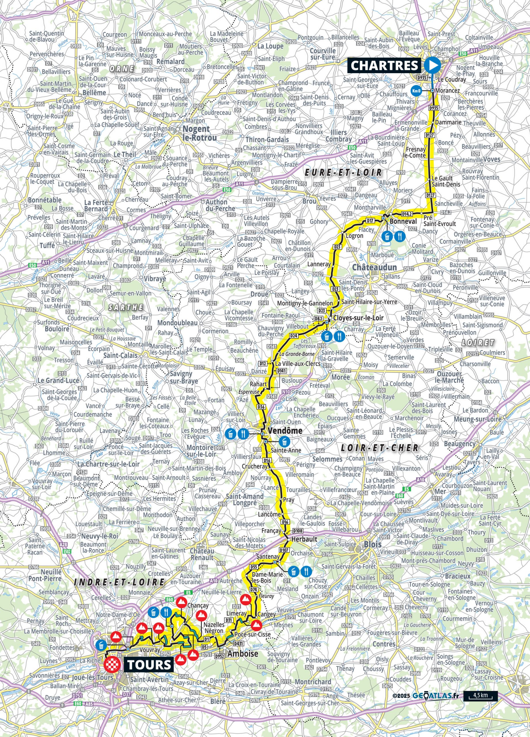 Ensuite, le parcours se poursuivra sur les routes du Loir-et-Cher en passant par la ville de Vendôme, pour, par la suite, une entrée dans le département d’Indre-et-Loire, au 134e kilomètre, avec la ville de Dame-Marie-les-Bois puis de Cangey.