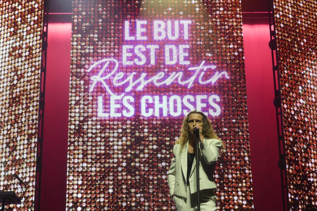 Pendant plus d’une heure et demi, il enchaîne ses plus grands succès (Coco câline, Paris Seychelles, Les Limites…) et les reprises qui marquent son dernier album (Kendji, Mylène Farmer…) avec un show visuel et lumineux du plus bel effet : de larges écrans tournoient sur scène, avec des effets 3D, diffusant tantôt l’artiste, tantôt son équipe, mais aussi le public, les paroles des chansons pour faire un karaoké, ou des visuels souvent saisissants.