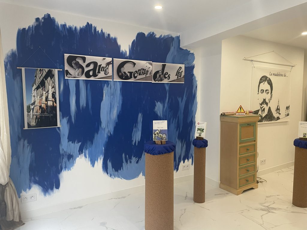 Grand admirateur de Marcel Proust, Dominique a choisi de faire de son amour pour l’écrivain français le thème principal de sa librairie. Portrait, photo de sa chambre (reconnaissable par ses murs en liège et ses draps bleus)… tout est pensé pour rendre hommage à l’auteur du texte A la recherche du temps perdu.