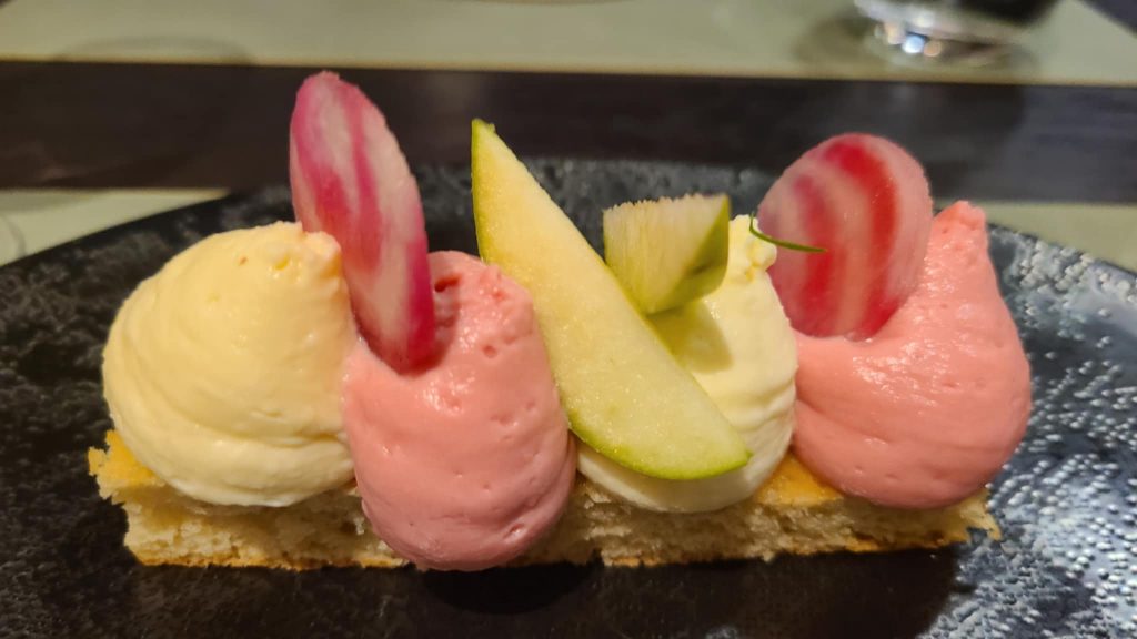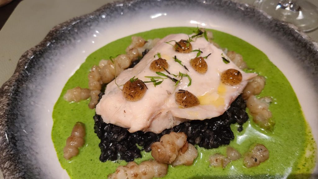 Pour commencer, on commande la réinterprétation du canard à l’orange avec filet froid séché, chips d’orange sanguine, panna cotta d’échalote et réduction au Grand Marnier. C’est frais savoureux, coloré. Rien à redire. Le plat est dans la même veine avec un filet de bar cuisson basse température au beurre de romarin qui surplombe un bon risotto nori citron noir et encre de seiche. Peut-être un regret sur l’assaisonnement qui aurait pu être plus affirmé. Bon point pour la sauce cresson douce ainsi que les crosnes glacés pour un clin d’œil aux délices de l’hiver.
