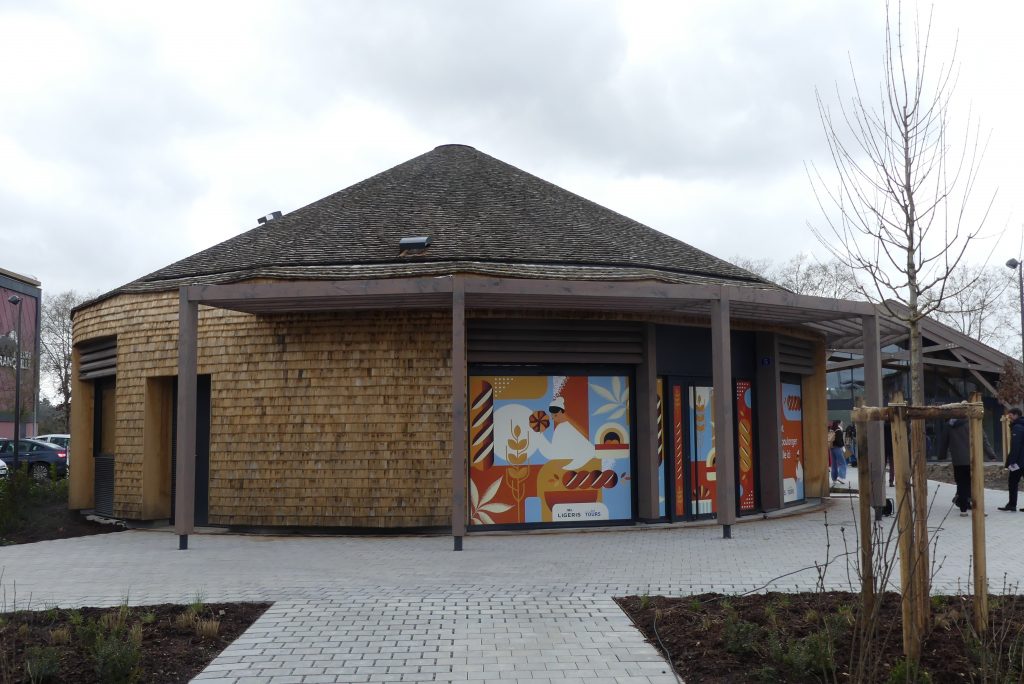 Pensé comme « un hameau écologique » ce centre commercial est composé de bâtiments à ossature bois, avec des poutres massives d’essences « locales », une isolation réalisée avec de la paille et une décoration murale avec de petits éléments de châtaigner taillés à la main. Des aménagements paysagers sont en cours de création, en attendant également des bancs ou une aire de jeux.