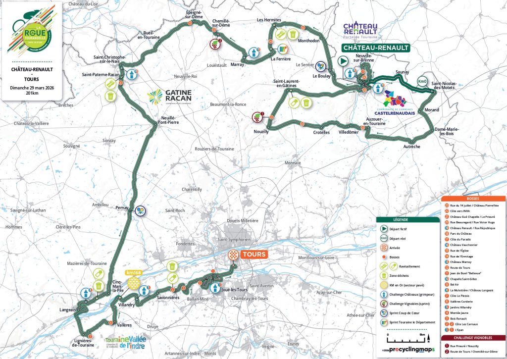 Côté parcours, après Chinon en 2025, le grand départ sera donné à Château-Renault, ville qui proposera de multiples animations la veille et le jour de la course (tous les renseignements sur le site officiel de La Roue Tourangelle :https://www.larouetourangelle.com). Les coureurs traverseront ensuite une partie de la Touraine et notamment l’ouest du département sur 201 kilomètres avant une arrivée rue du Général Renault à Tours.