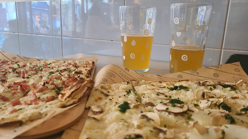 Découpées en petits carrés à picorer, vendues 9€50, ces flammekueches sont pensées pour le partage, avec une formule à 12€ si on y ajoute un demi de blonde (sans oublier de boire avec modération). Également possible de prendre d’autres petites gourmandises comme du saucisson. Une soirée de lancement est programmée ce vendredi 3 avril avant un autre événement le dernier week-end du mois : les dix ans de la brasserie La P’tite Maiz’ de Christophe et Quentin.