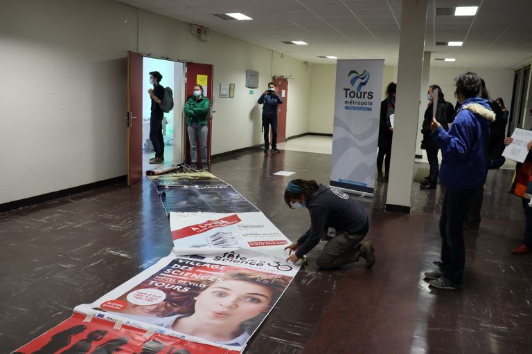 Alors que le Conseil Métropolitain présentait ce lundi soir son projet de règlement local de publicité intercommunal (RLPi), une vingtaine de personnes sont venues manifester devant la salle du conseil au moment de son lancement. Les personnes présentes, membres des collectifs RAP (Résistance à l’agression publicitaire), ANV Cop21 et Paysage de France, ont étalé dans le calme des banderoles publicitaires au sol et demandé un entretien avec les élus.