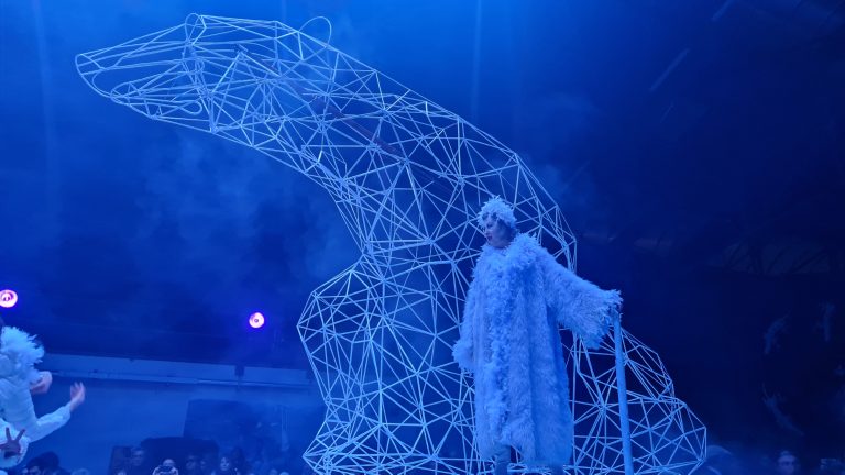 Dans ce spectacle, l’ours géant articulé s’accroche à sa calotte glaciaire et est entouré de peuples inuits et d’une cantatrice, diva des glaces qui cherche à apaiser ce monde pris dans une fureur. Bref c’est poétique et doux, un spectacle où l’humain et la technique s’associent comme savent faire les Off depuis de nombreuses années.