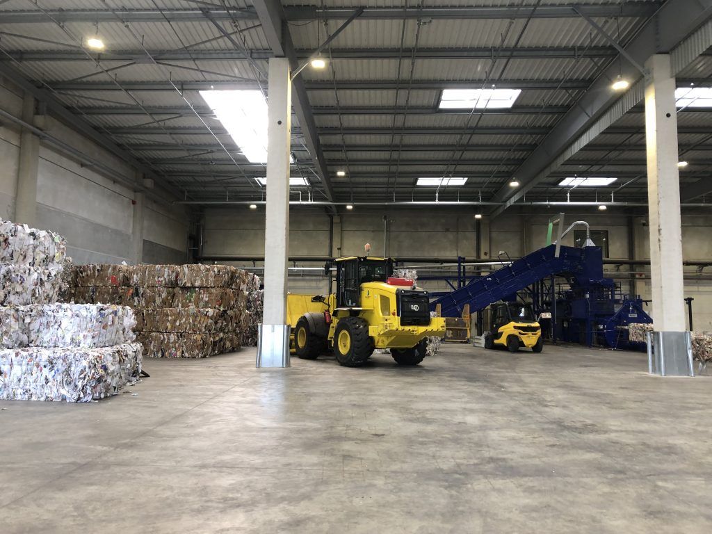 Une fois les balles de matière réalisées, celles-ci sont stockées dans ce grand hangar pour être ensuite redistribuées dans les différentes filières nationales de recyclage.