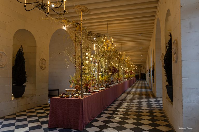 A Azay-le-Rideau, le thème exploré reste celui de la gourmandise, en allant explorer les références aux repas des contes comme Blanche Neige ou Peau d’Âne. Le monument dont on célèbre les 500 ans de la construction a décidé de retravailler avec plusieurs artistes sollicitées ces dernières années comme Véronique Pineau qui réutilise de la vaisselle et des ustensiles de cuisine pour en faire des œuvres d’art et a réalisé un jeu d’échec en lien avec Alice au pays des merveilles pour la cuisine du château. Chaque pièce sera par ailleurs décorée de tables dressées avec de la porcelaine de Gien et des soieries de la maison tourangelle Roze.