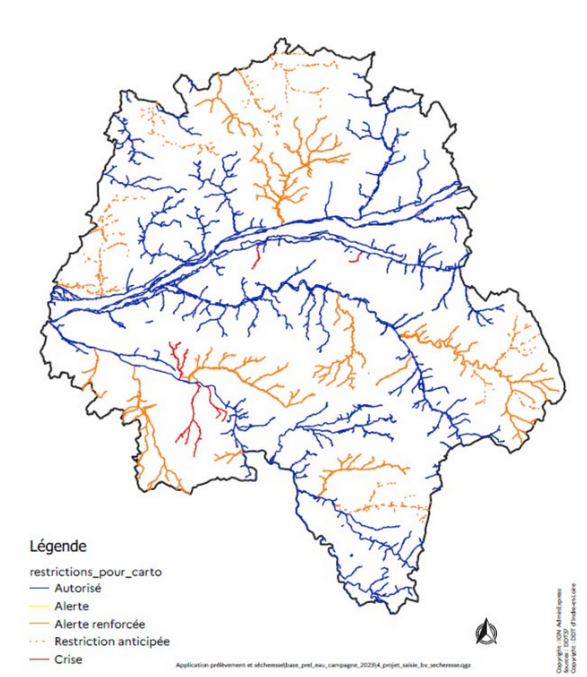 - En crise : pas d’arrosage des potagers de 8h à 20h, 0 remplissage de piscine, de massifs fleuris, d’arbres, pelouses ou arbustes, aucun lavage de véhicule sauf impératif sanitaire, pas d’arrosage par les mairies pour les pelouses ou arbustes, sauf s’ils ont moins d’un an. Les massifs fleuris d’intérêt particulier peuvent être abondés en eau de 20h à 8h. Aucune irrigation par aspersion chez les agriculteurs, ni d’irrigation localisée.